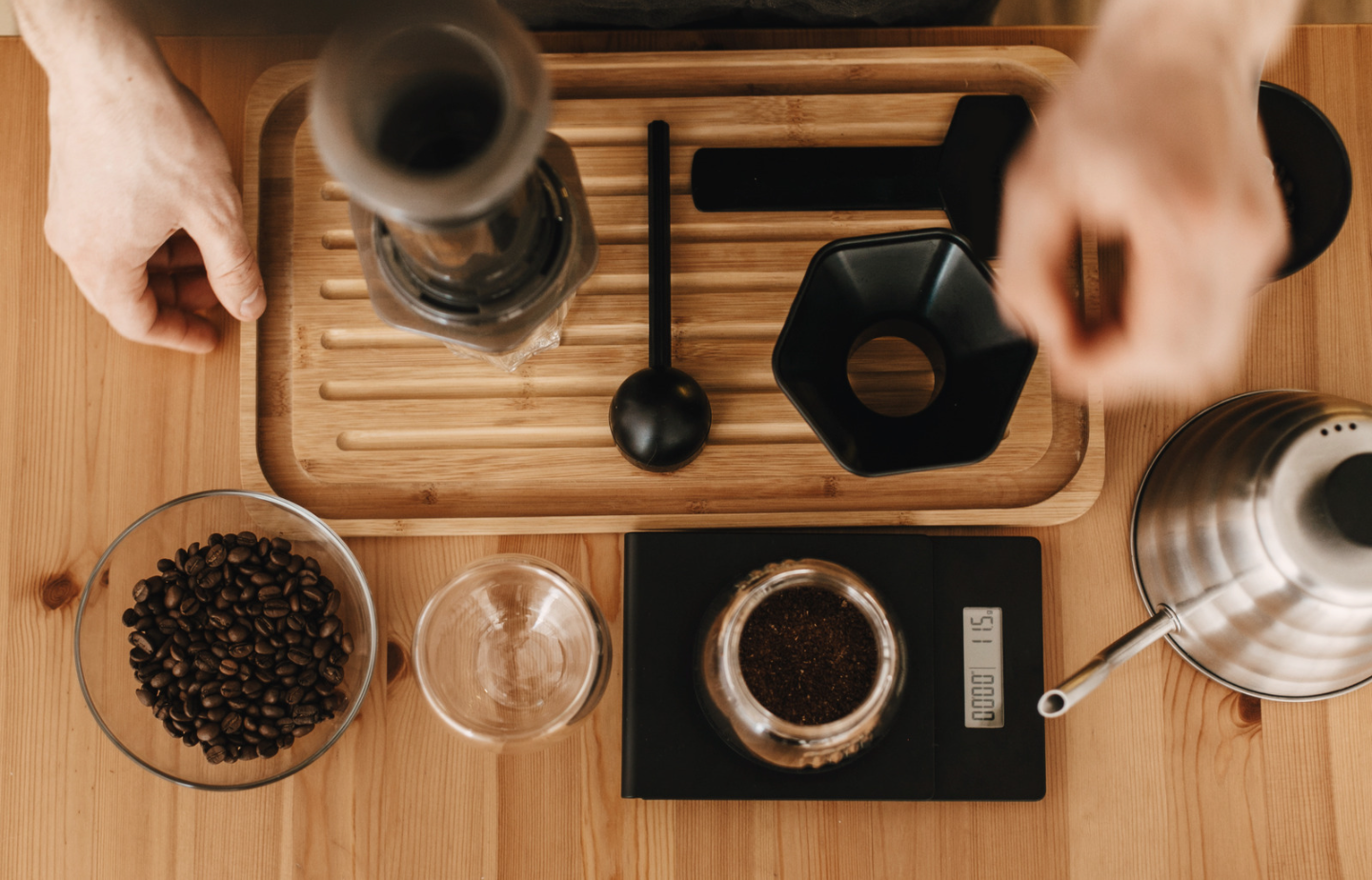 Entferne die AeroPress von der Tasse und entsorge den Kaffeesatz und den Papierfilter. Spüle die AeroPress gründlich ab