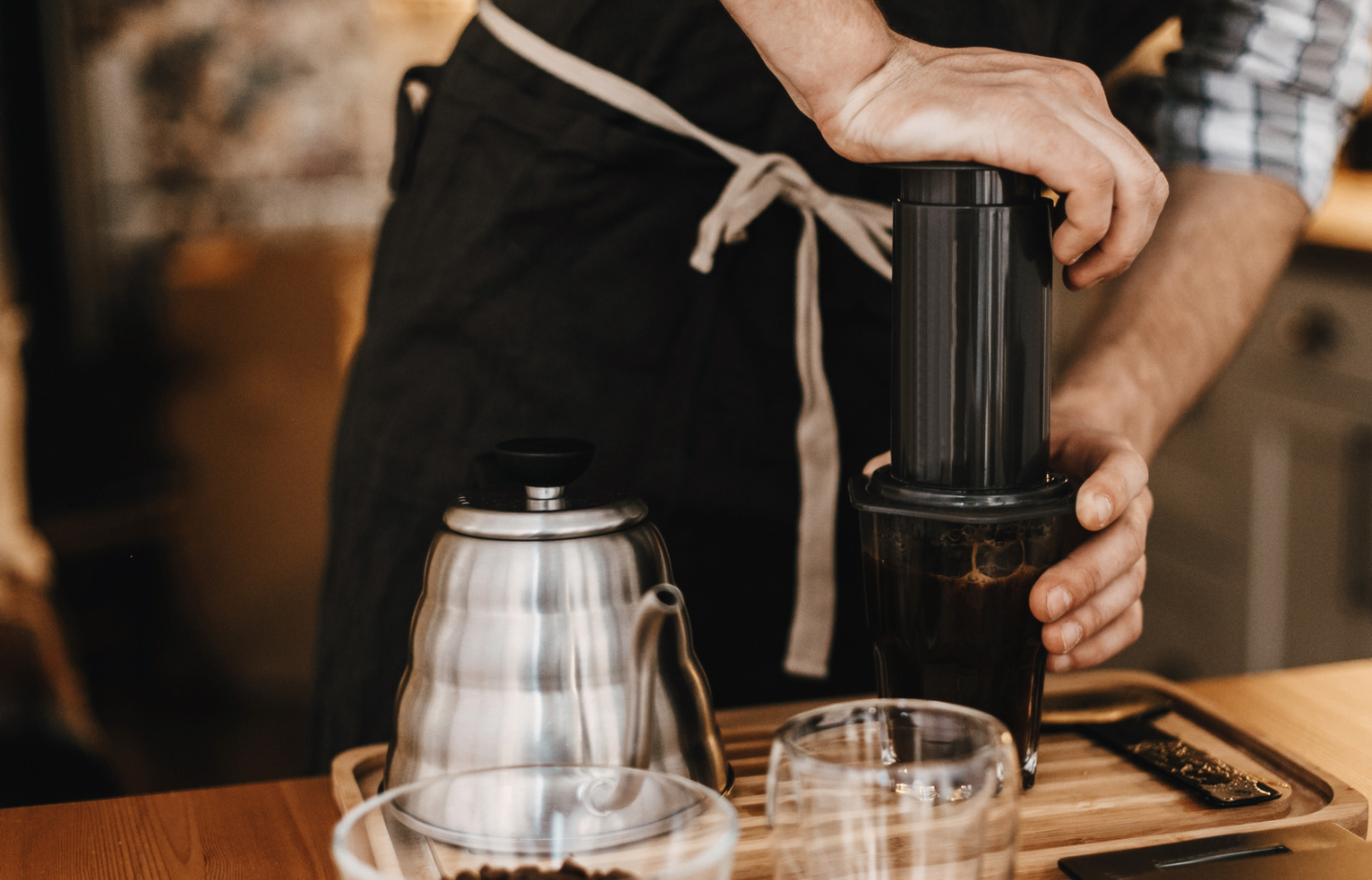 Befestige den Plunger der AeroPress und drücke ihn langsam nach unten, um den Kaffee durch den Filter in die Tasse zu drücken -